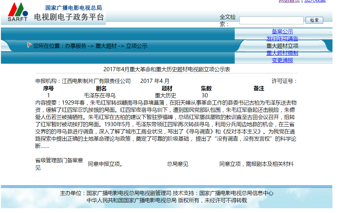 電視劇《毛澤東尋烏調(diào)查》獲得立項公示